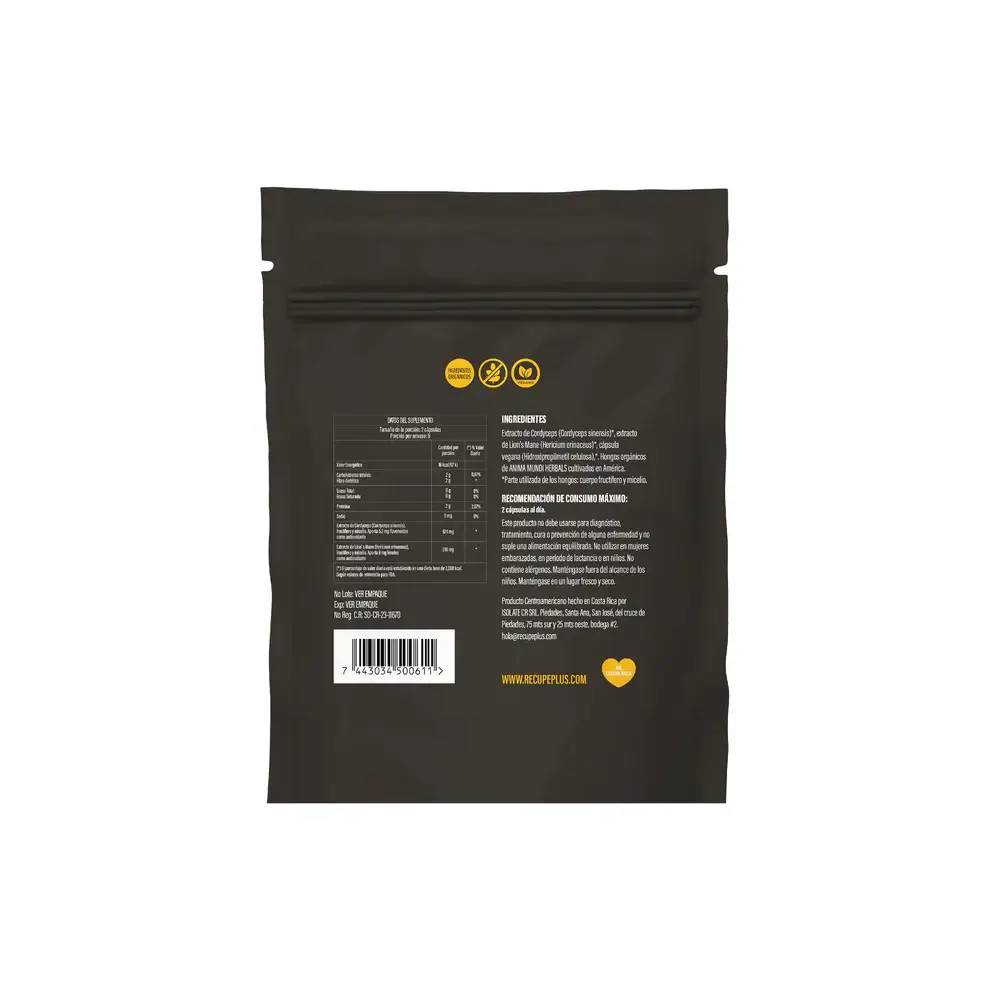 Componentes: cada 2 cápsulas contienen: Extracto de cordyceps 924mg, extracto de melena de león 396mg, Exc. c.s.