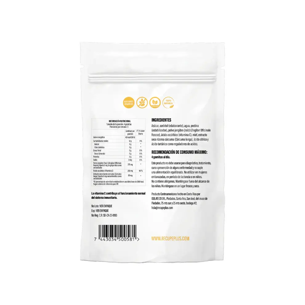 Componentes: cada 4 gomitas contiene: Polvo de jengibre 276mg, vitamina C 268mg, extracto seco rizoma cúrcuma 80mg, Exc. c.s.