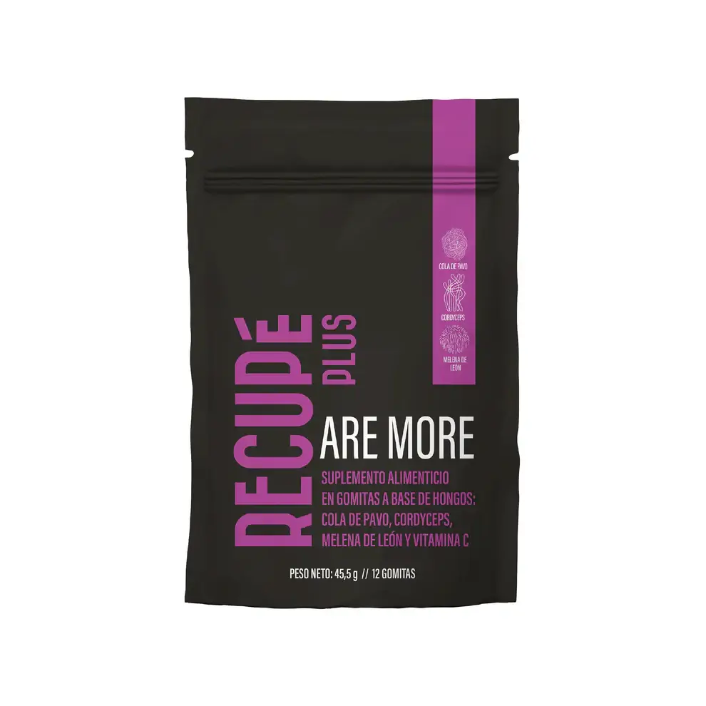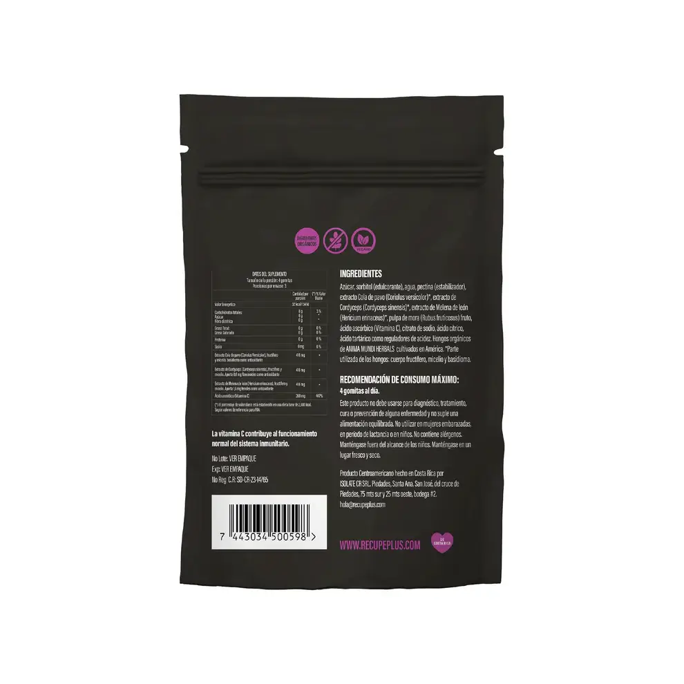 Componentes: cada 4 gomitas contiene: Extracto cola de pavo 416mg, extracto de melena de león 416mg, extracto de cordyceps 416mg, vitamina C 268mg, Exc. c.s.