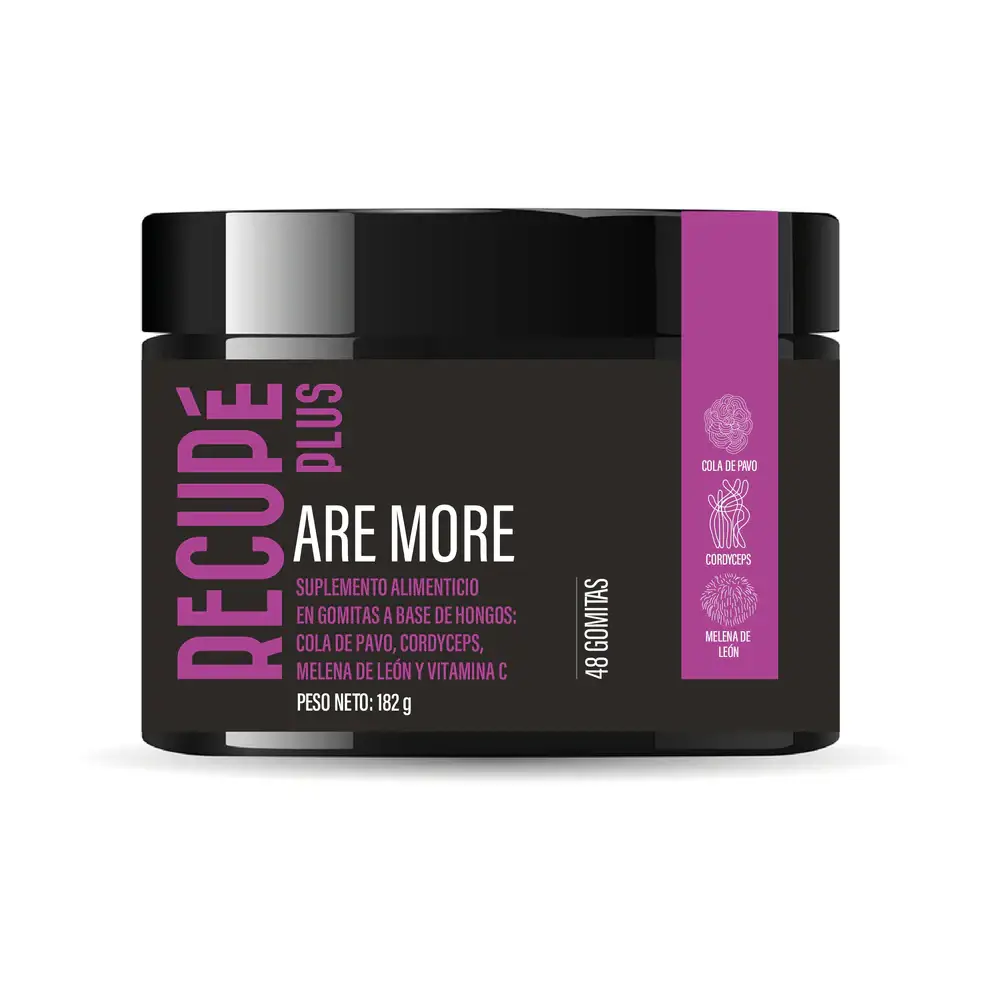Componentes: cada 4 gomitas contiene: Extracto cola de pavo 416mg, extracto de melena de león 416mg, extracto de cordyceps 416mg, vitamina C 268mg, Exc. c.s.