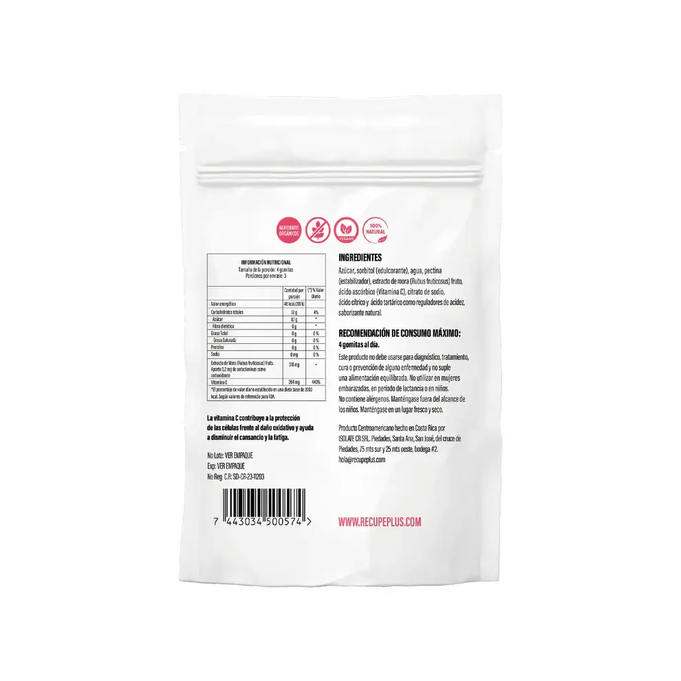 Componentes: cada 4 gomitas contienen: Extracto de mora fruto 316mg, vitamina C 264mg, Exc. c.s.