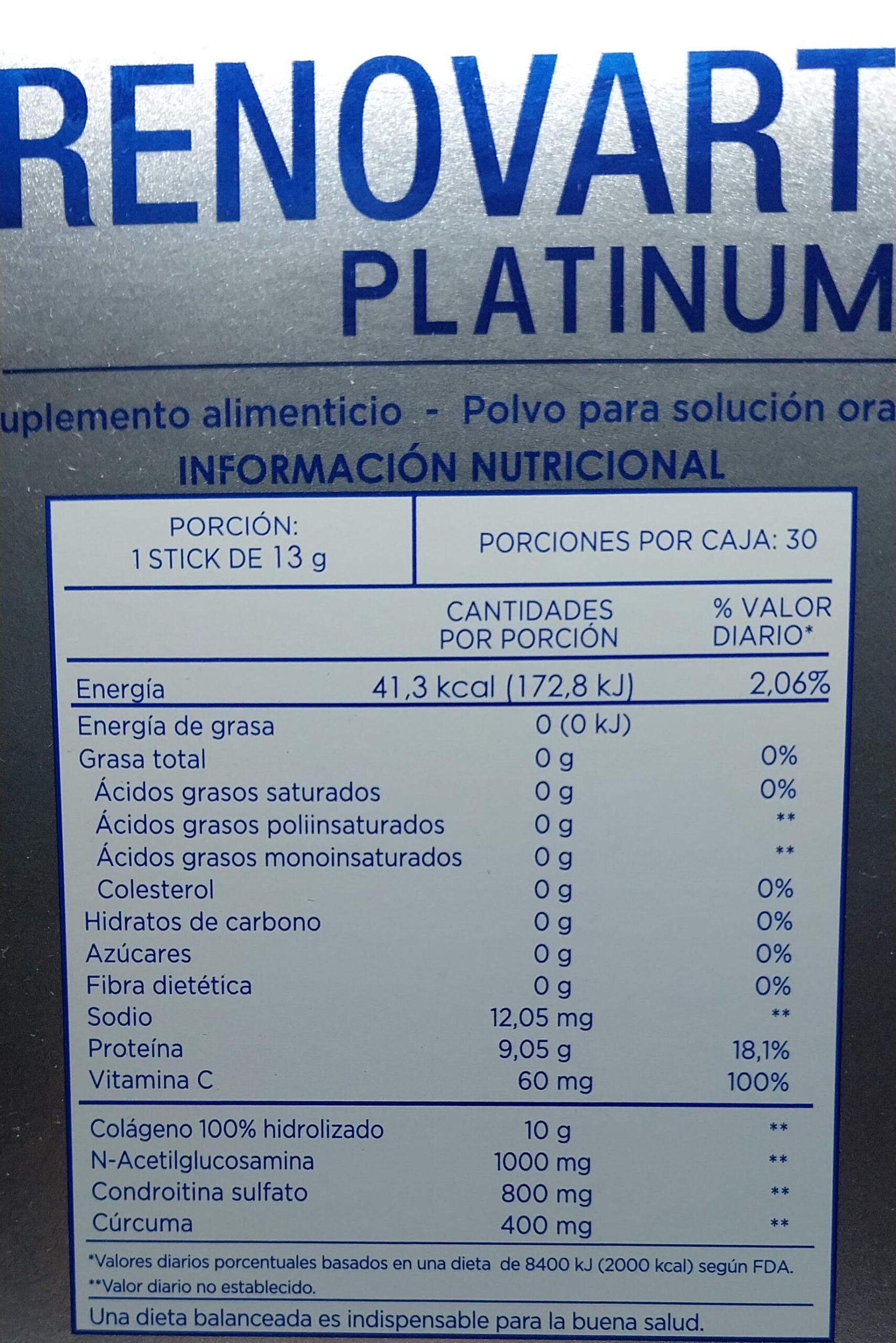Componentes: Colágeno 100% hidrolizado 10g, cúrcuma 400mg, condroitina sulfato 800 mg, n-acetilglucosamina 100mg, vitamina C 60mg.