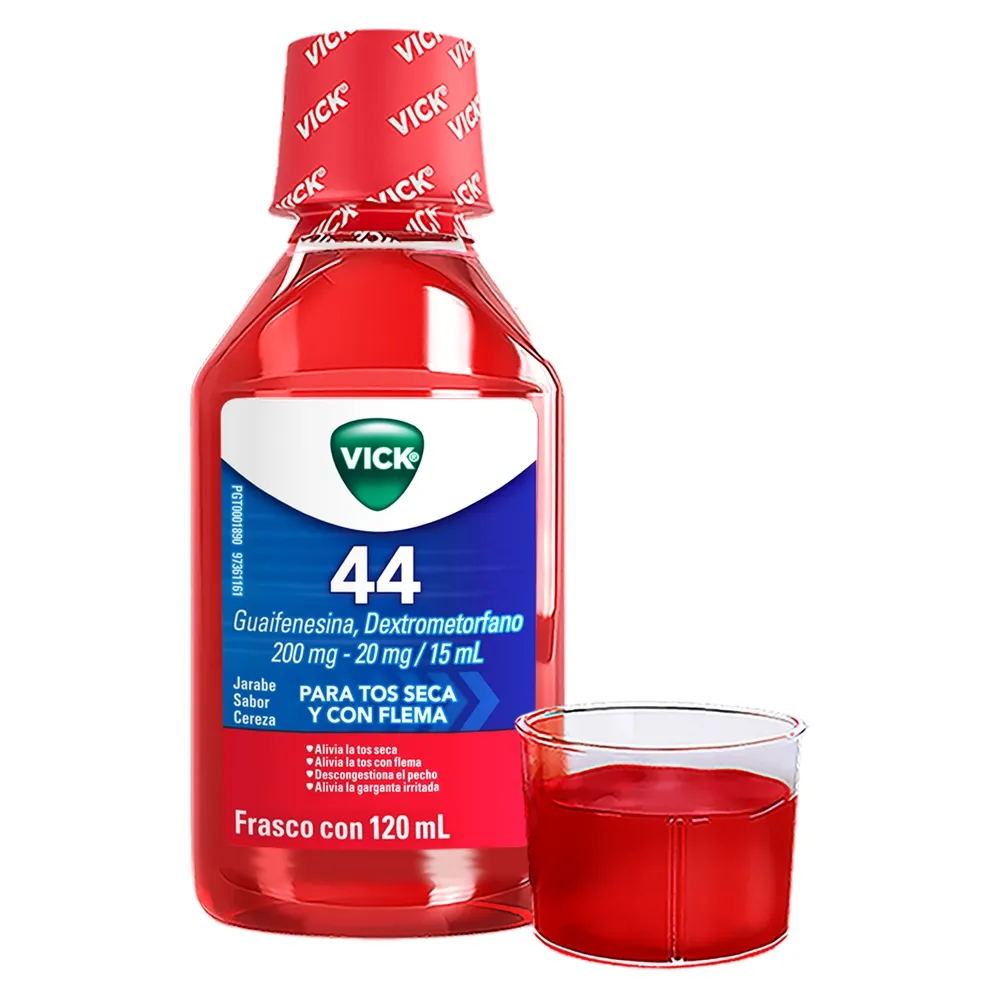 Componentes: cada 100ml contiene: Guaifenesina 1.33g, bromhidrato de dextrometorfano 0.133g, Exc. c.s.